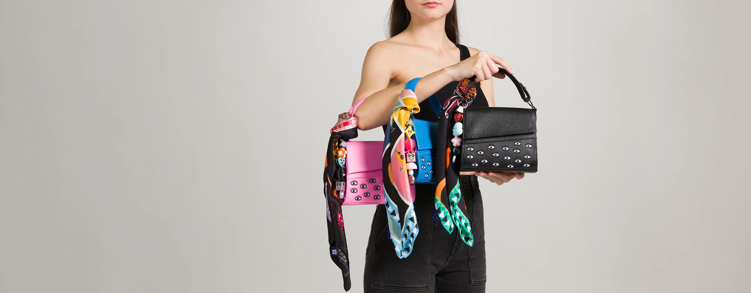 Vali Crossbody Soft Neon Pink and Moonwalk Gray - All Over Eyes Embroidery - Handles View