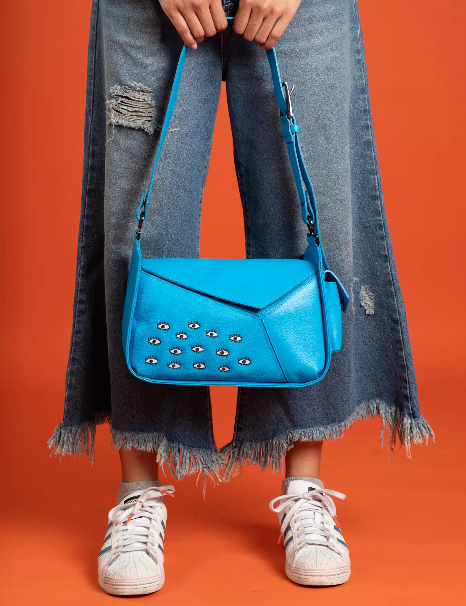 Harold Fanny Pack Cerulean Blue Leather - All Over Eyes Embroidery - Front