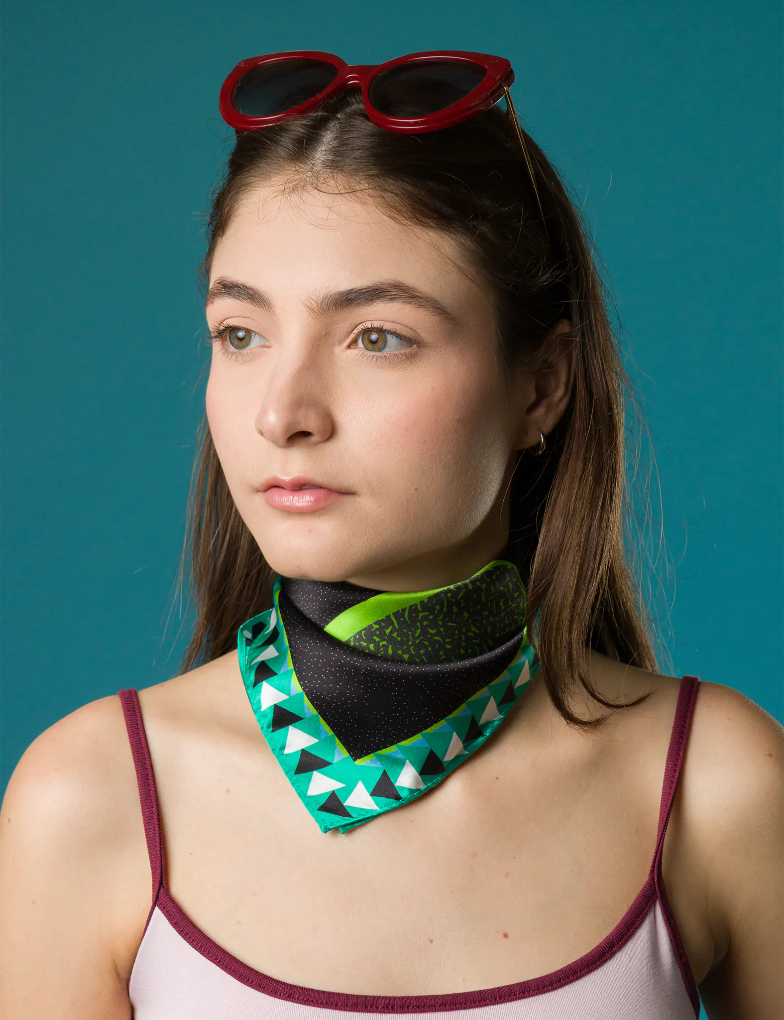 A woman wearing bold yellow sunglasses and a sheer white top with navy trim poses with a black and green Min & Mon silk scarf tied around her neck, featuring the brand's logo.