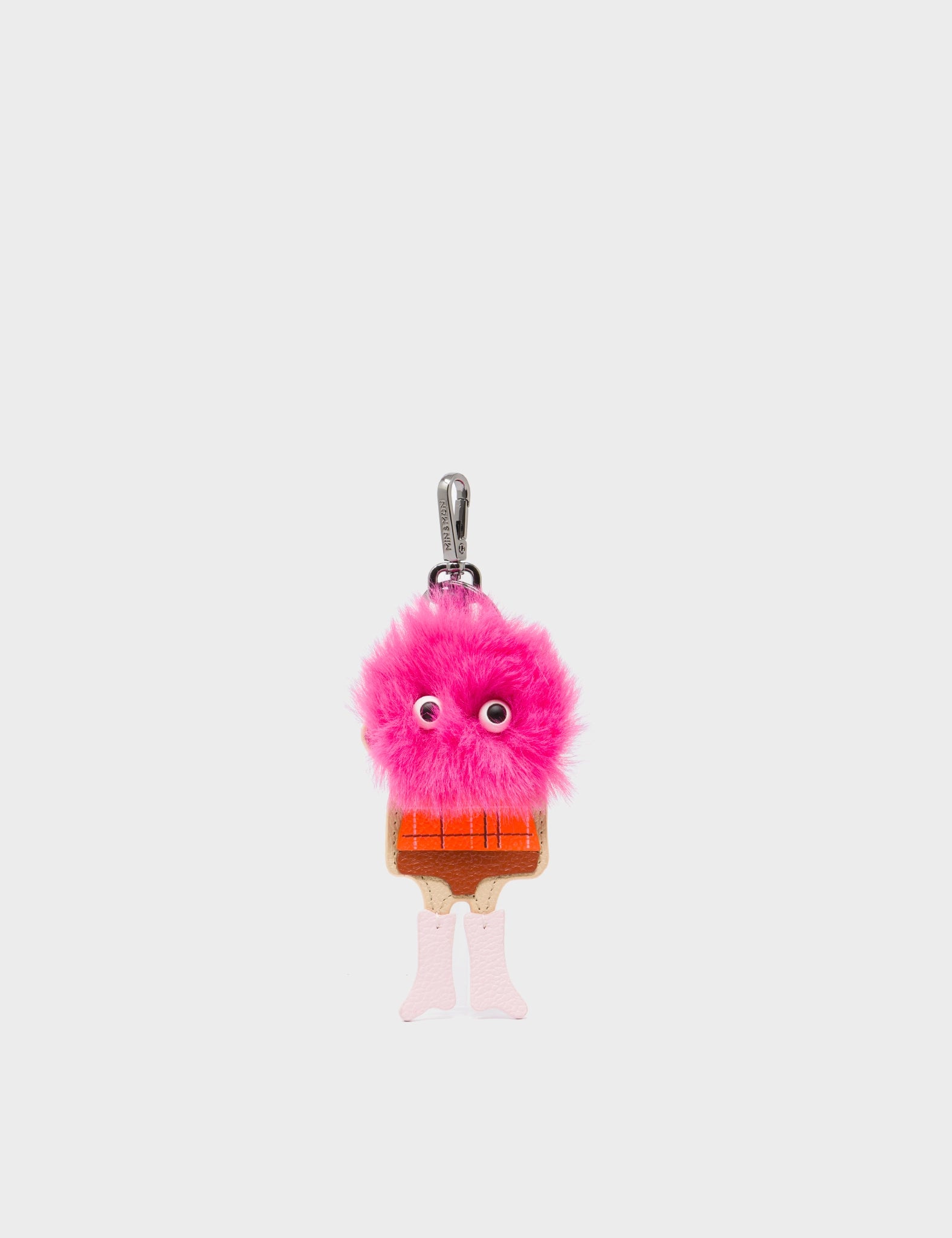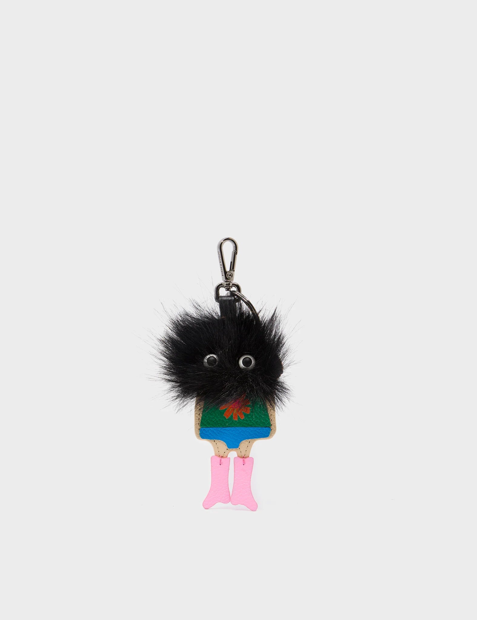 Close-up of a person holding a brown and tan handbag with black-and-white eye motifs and a fluffy brown keychain charm shaped like a quirky character.