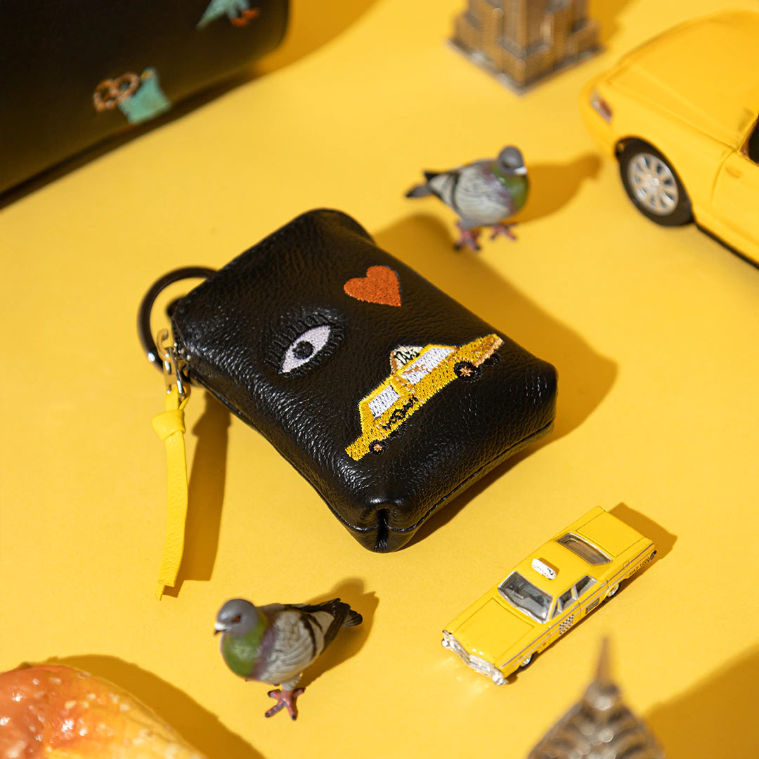 Almost as charming as seeing a sea of brightly colored NYC taxi cabs in person, our sweet little keychain is here to add a touch of big city charm to your look! With three embroidered icons and a matching leather zipper pull, this cuteness is here to help during the commute; clip it to the included loop on your Min & Min carrying strap with the attached, stainless steel swivel hardware for easy access for your cash to tip your cabbie or grab a bite at a food cart!