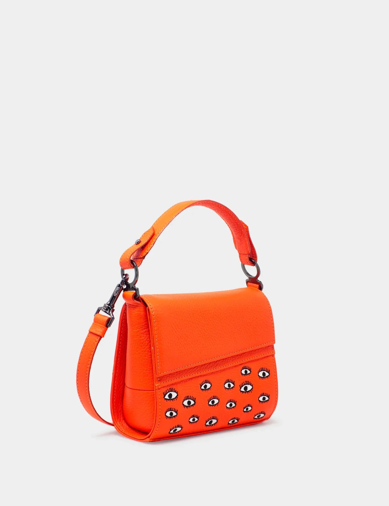 On a chic, horizontally cut flap, Min & Mon’s iconic All Over Eyes design covers the luxurious neon orange leather in a quirky embroidered eye pattern. With a hidden magnetic closure sewn into the flap, you’ll always have a reliable way to secure your belongings. And if a handbag isn’t what you need one day, simply clip on the included leather crossbody strap or pop over to our selection of individual straps to customize your designer bag!